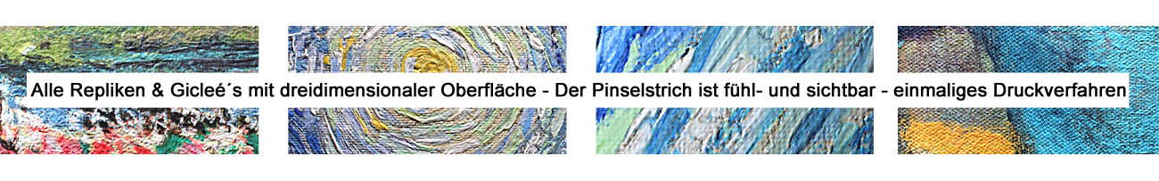 Die Giclées bedienen sich einem kostengünstigeren Digitaldruckverfahren, das auch für herkömmliche Giclées Verwendung findet. Unsere Meisterwerke unterscheiden sich allerdings in Qualität und Herstellung deutlich von herkömmlichen Giclées: Während jene ein reines Computerprodukt sind, dient uns der Digitaldruck nur als Rohling. Auf der Grundlage dieses Drucks wenden wir ein in dritter Generation erprobtes Verfahren an, um die Kunstdrucke zu veredeln und ihnen eine echte Oberflächenstruktur zu verleihen. So erreichen auch unsere Giclées eine Qualität, die sonst unerreicht bleibt.