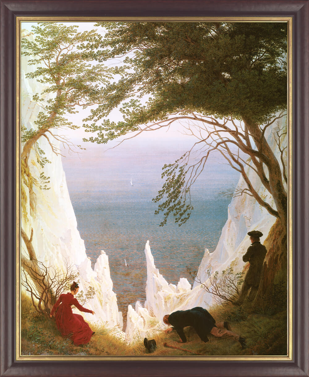 "Die Kreidefelsen von Rügen" zählen wohl zu den bekanntesten Werken Caspar David Friedrichs. Eine Kluft in den strahlend weißen Kreidefelsen gibt den Blick frei auf die Ostsee. Es bleibt dem Betrachtenden der Szenerie überlassen, ob sein Blick mit dem stehend an einem Baum lehnenden Mann über die Weite des Wassers schweift oder ob er eher - wie die Frau und der knieende Mann - sein Augenmerk auf die Felsen und den Abgrund direkt vor den Personen richtet.