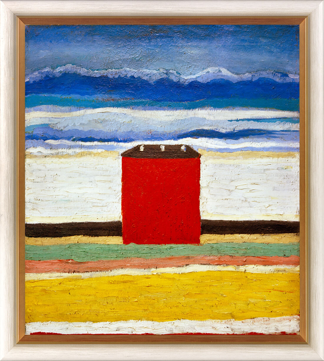 Malewitsch, ein Hauptvertreter der russischen Avantgarde und Begründer des Suprematismus, versteht es in diesem Bild meisterlich, das Spiel zwischen abstrakt und gegenständlich in Szene zu setzen. Sein rotes Haus scheint sich zwischen den hellen Farbflächen links und rechts nach vorne abzusetzen und erzeugt so Räumlichkeit. Die waagrechten Farbflächen vermitteln dem Betrachter ein Gefühl von sonnigem Strand, Meer und Horizont.