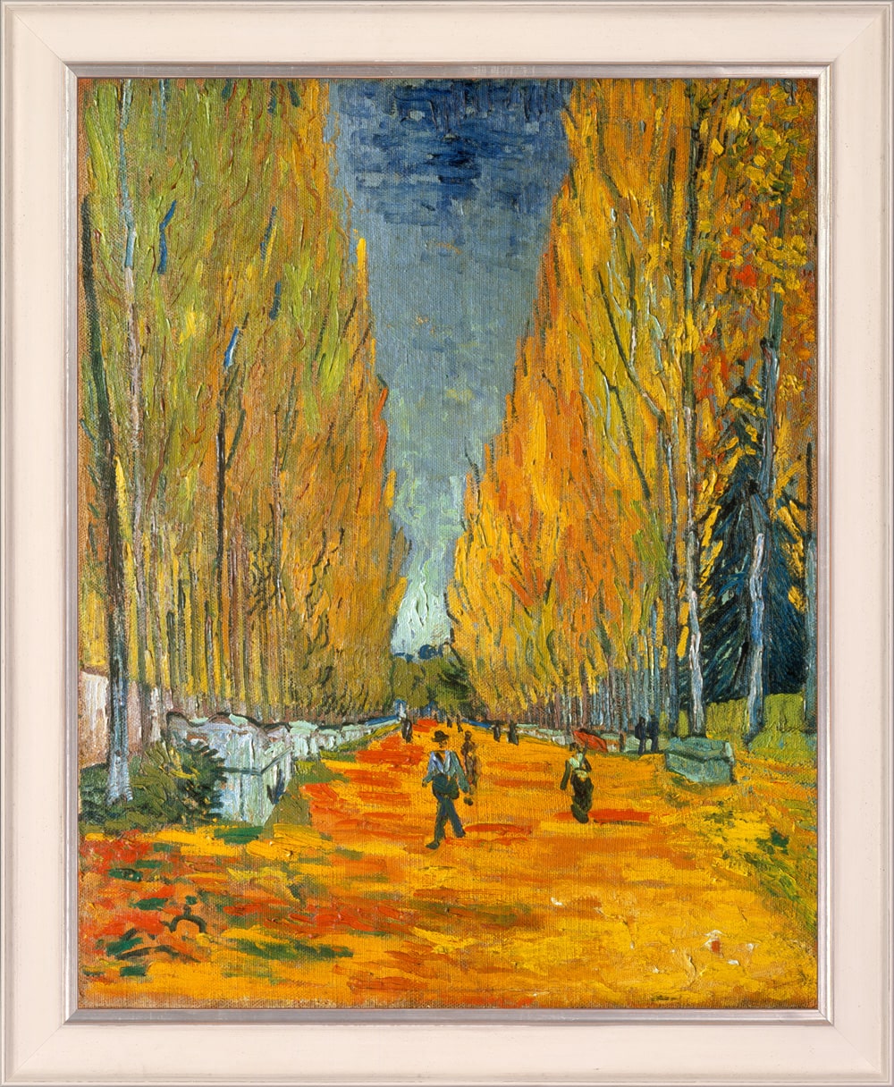Van Goghs Motiv zieht den Betrachter durch seine kräftigen gelben und orangen Farbtöne in den Bann. Der Blick wird unwillkürlich entlang der Allee ins Bild geleitet, endet im Grün und richtet sich dann auf den Himmel, dessen Stimmung von einem kommenden Gewitter kündet.